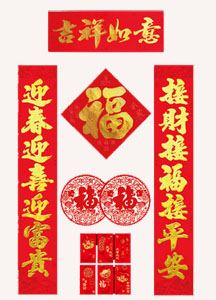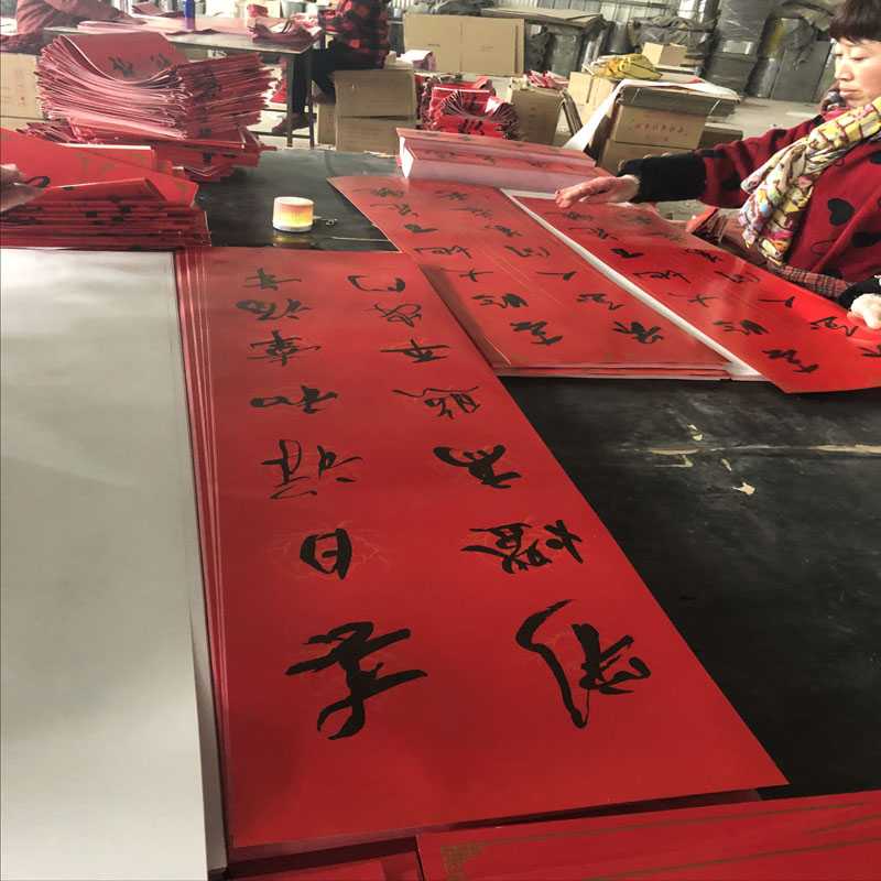 紙對(duì)聯(lián)一般指用毛筆在紅紙或其他普通紙上書寫的對(duì)聯(lián),書寫效果最為常見。植絨對(duì)聯(lián)是用金粉裝飾機(jī)器印刷或手寫的對(duì)聯(lián),使其更加明亮、閃閃發(fā)光、更加耀眼。