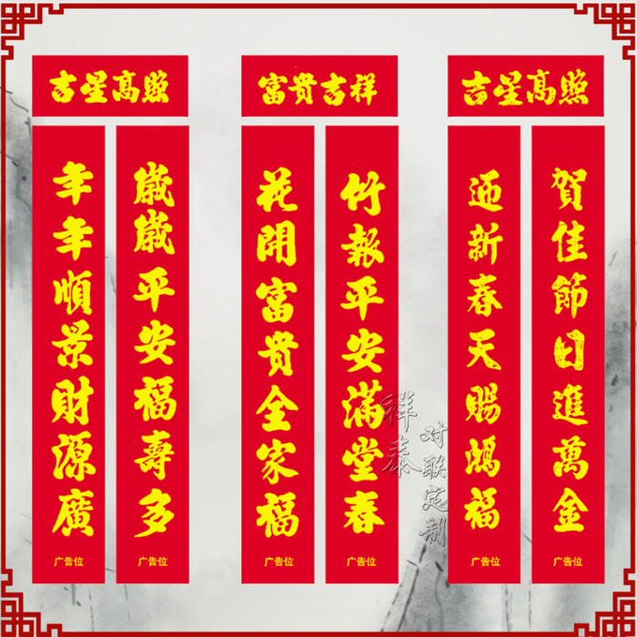 公司主要產品:廣告春聯(lián)、定做春聯(lián)、定制春聯(lián)、禮品春聯(lián)、高檔廣告春聯(lián)制作.促銷廣告春聯(lián)等,我們的服務宗旨:信譽比承諾好、質量比價格高。我公司是菏澤專業(yè)的春聯(lián)印刷廠和對聯(lián)印刷廠。是專業(yè)生產和設計對聯(lián),年畫春聯(lián)印刷廠、春聯(lián)印刷廠、對聯(lián)印刷廠、